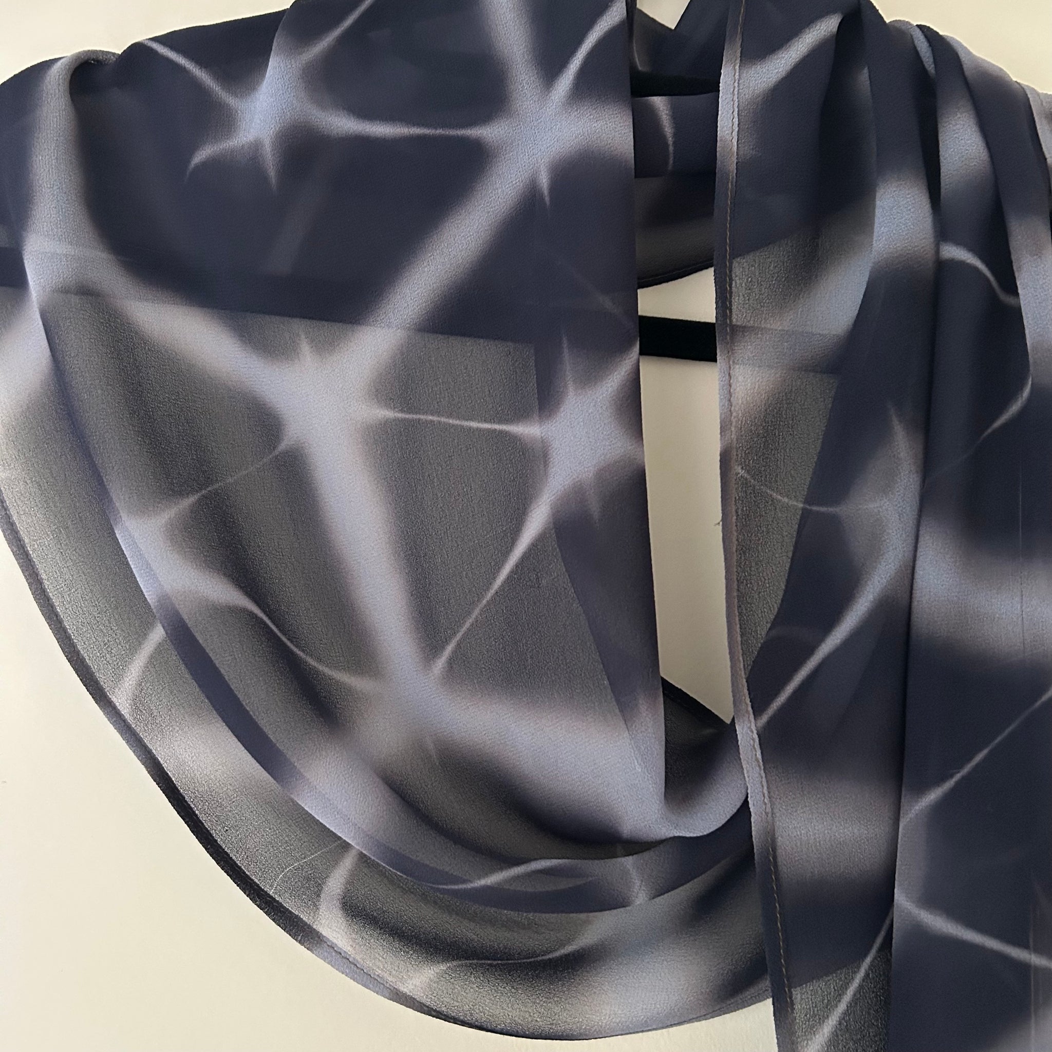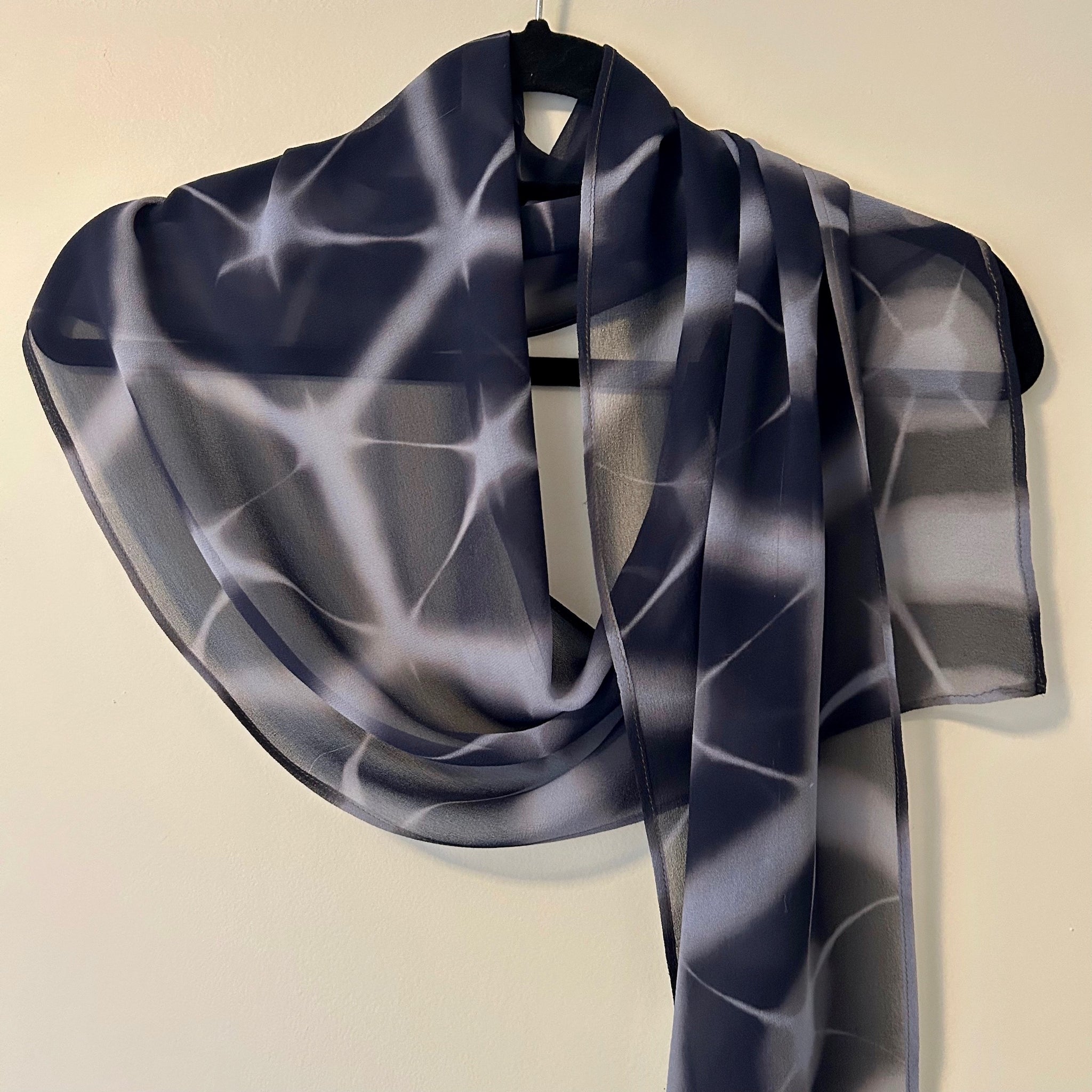 Description: Keep warm with this handwoven scarf in alpaca and merino blend, in steel grey warp and purple weft, handwoven by Joy Dodd. Lightweight, soft and warm.Size: 166cm long plus...