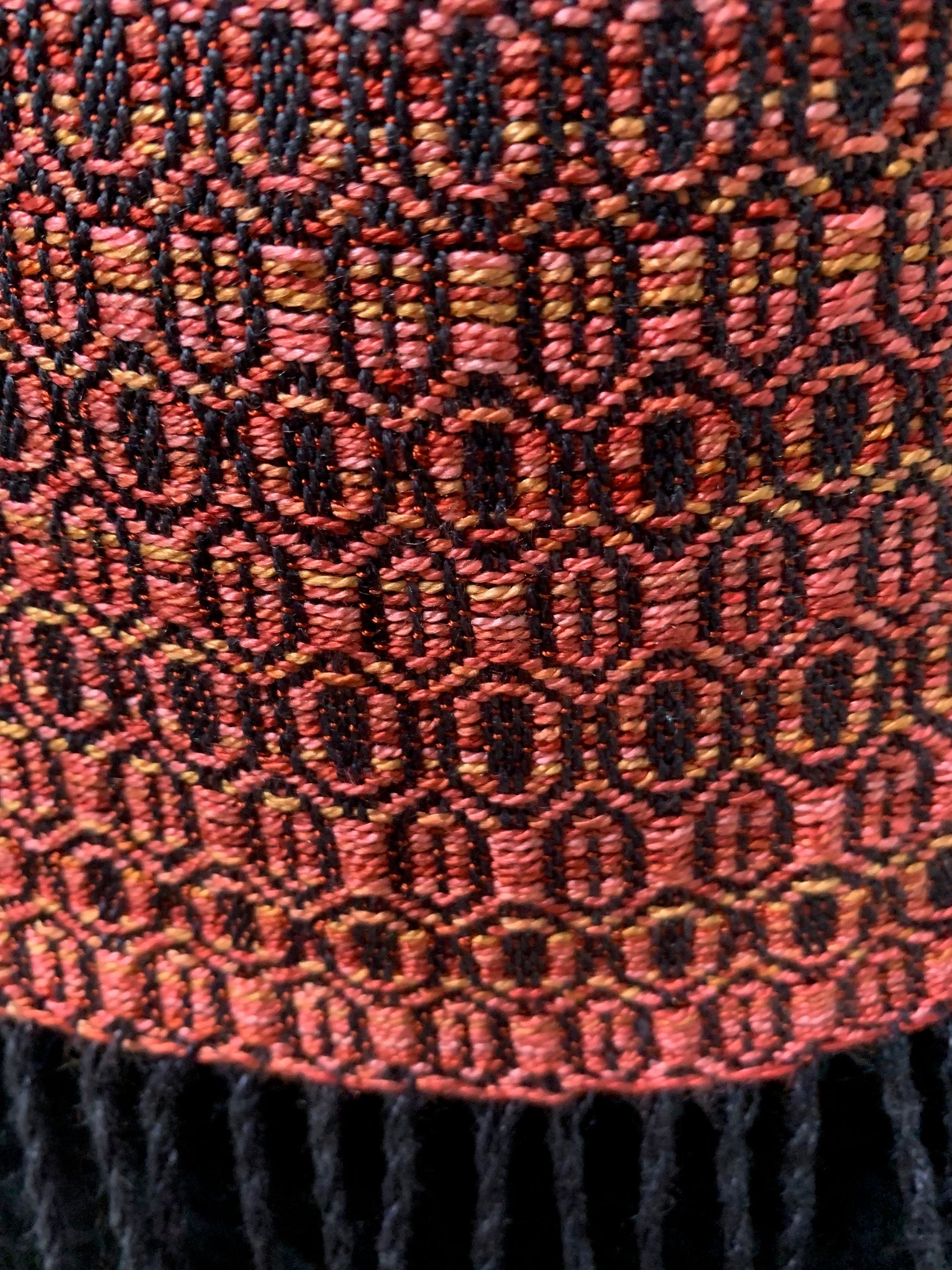 Silk scarf handwoven and hand dyed by Helen Wilder. The warp is black and the weft is woven in red, orange and yellow tones which makes the scarf sparkle. It...