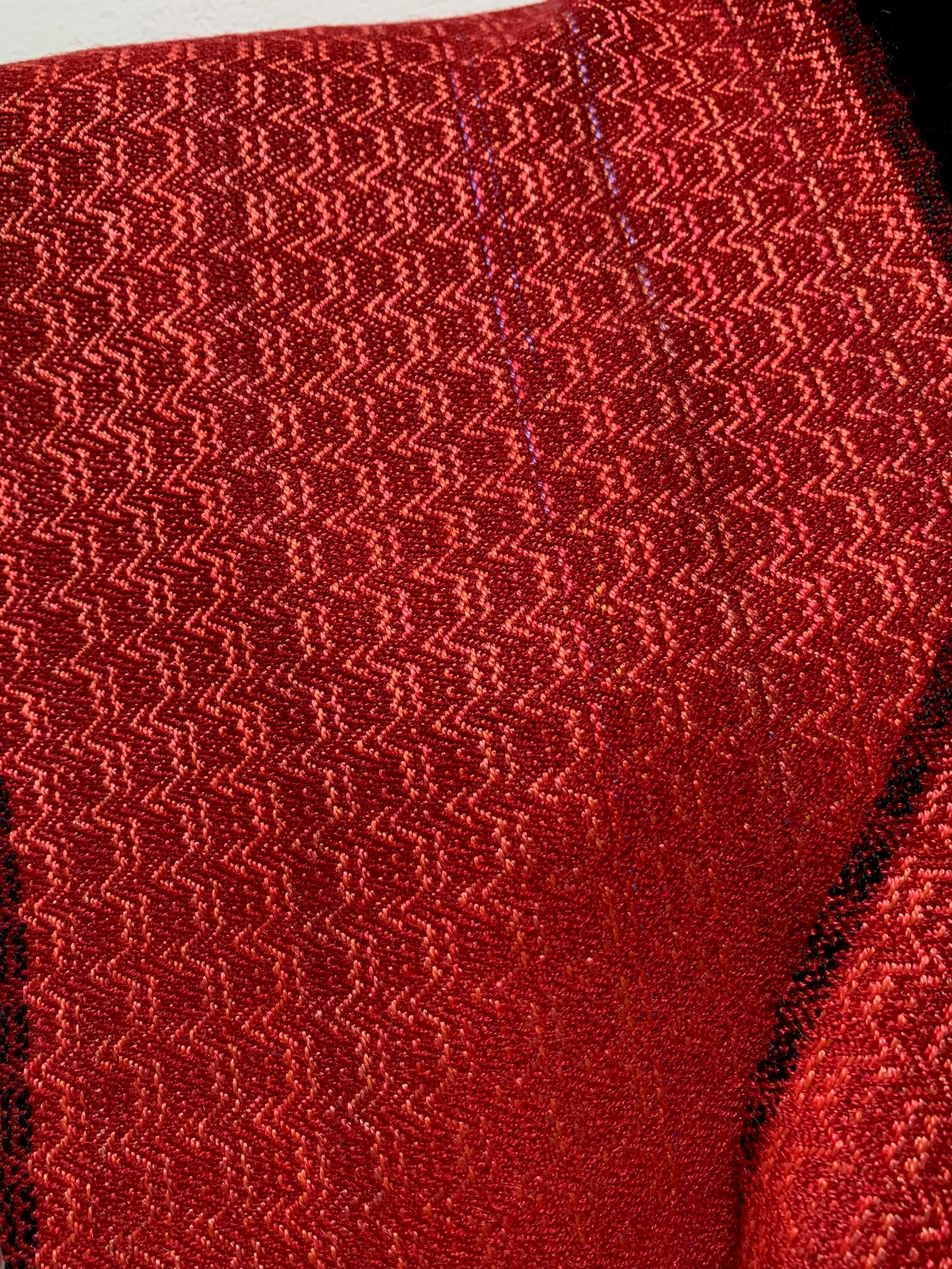 Handwoven silk scarf in bright red and orange colours with a small black stripe at the sides. It has a lovely drape and a lovely shine. It brightens up your...