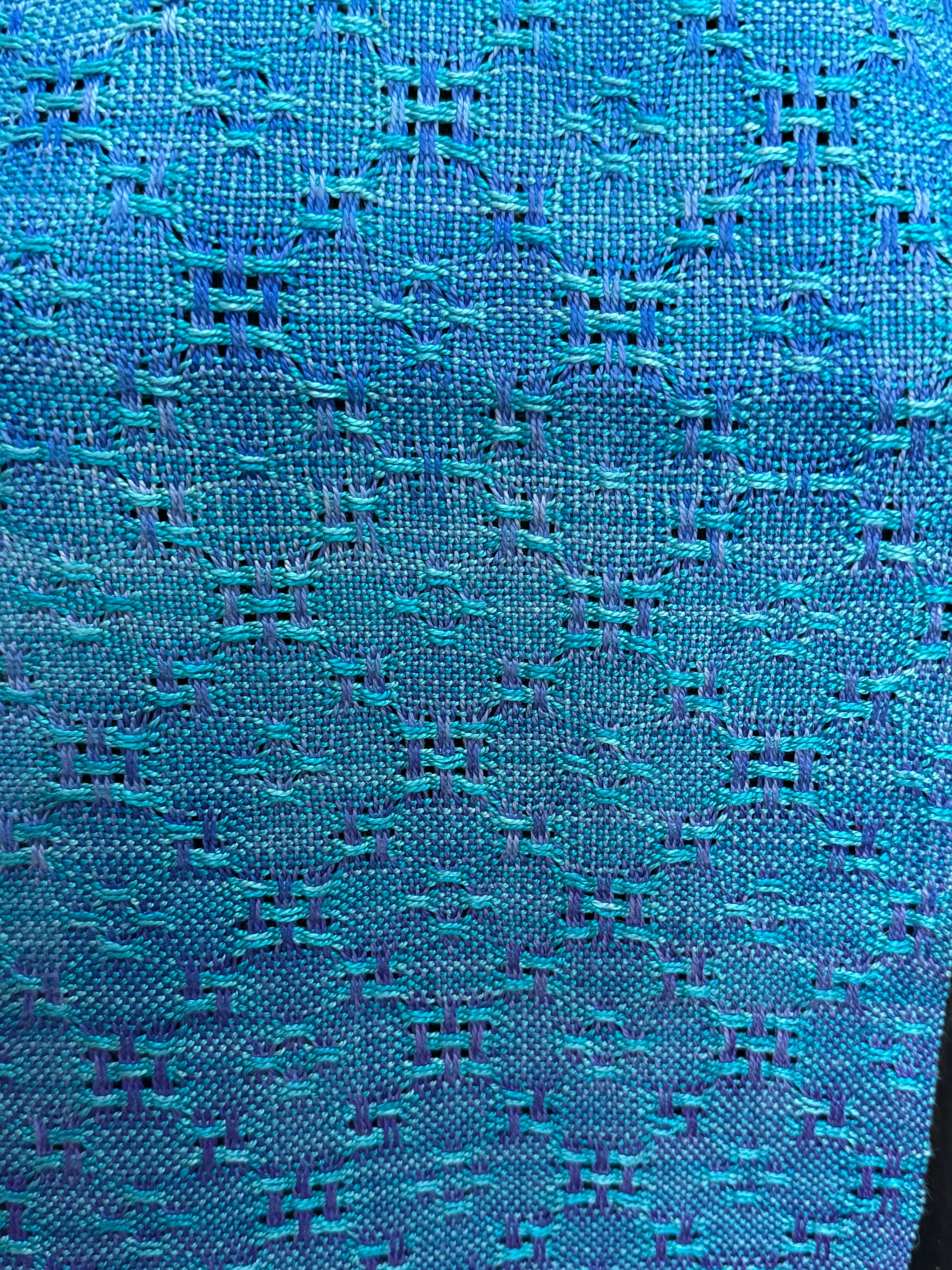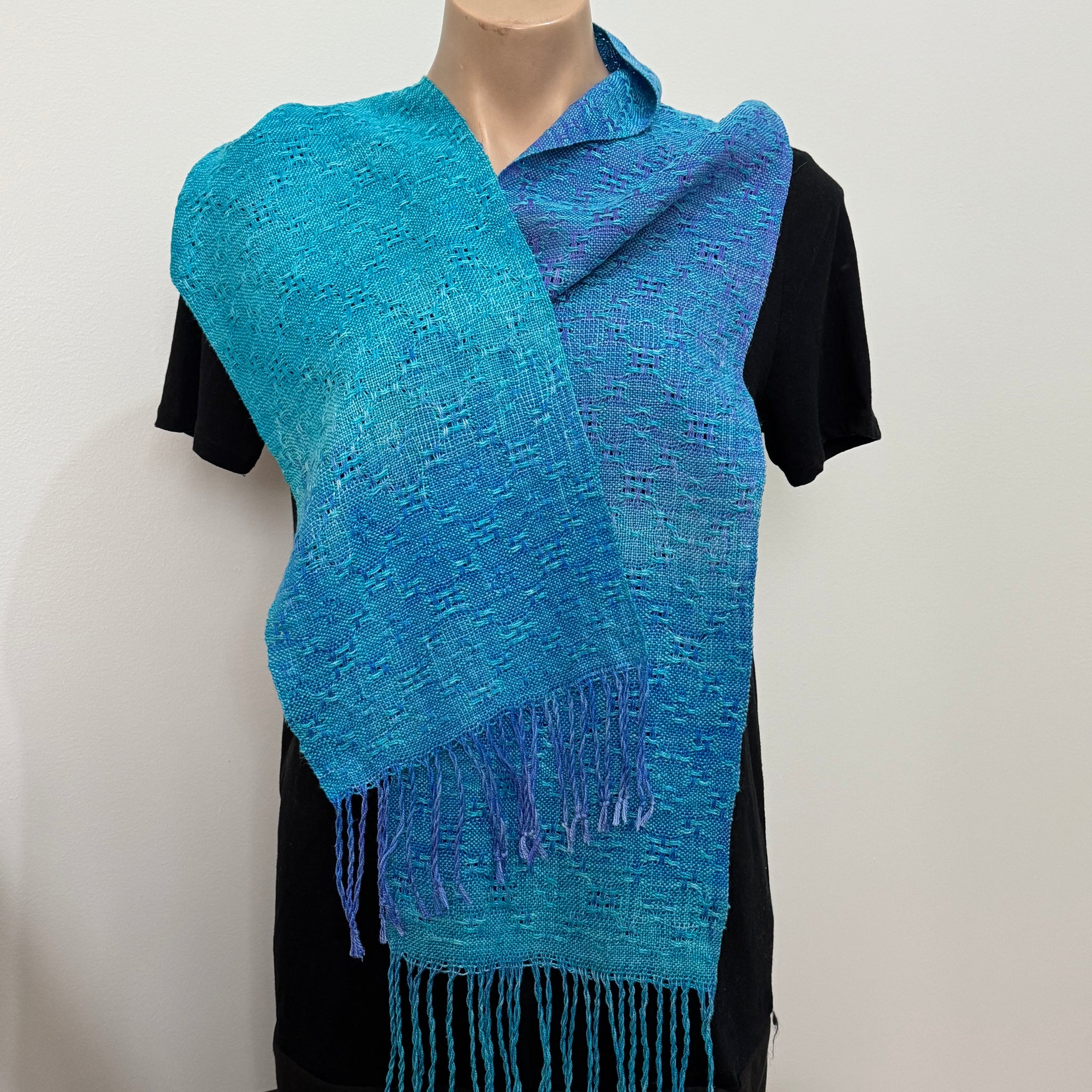Handwoven pure silk yarn hand-dyed in sea blues, purple & turquoise by Joy Dodd Size: 163cm long plus fringe X 22cm wide. Care: Handwash only in warm/cool water. Do not tumble dry.