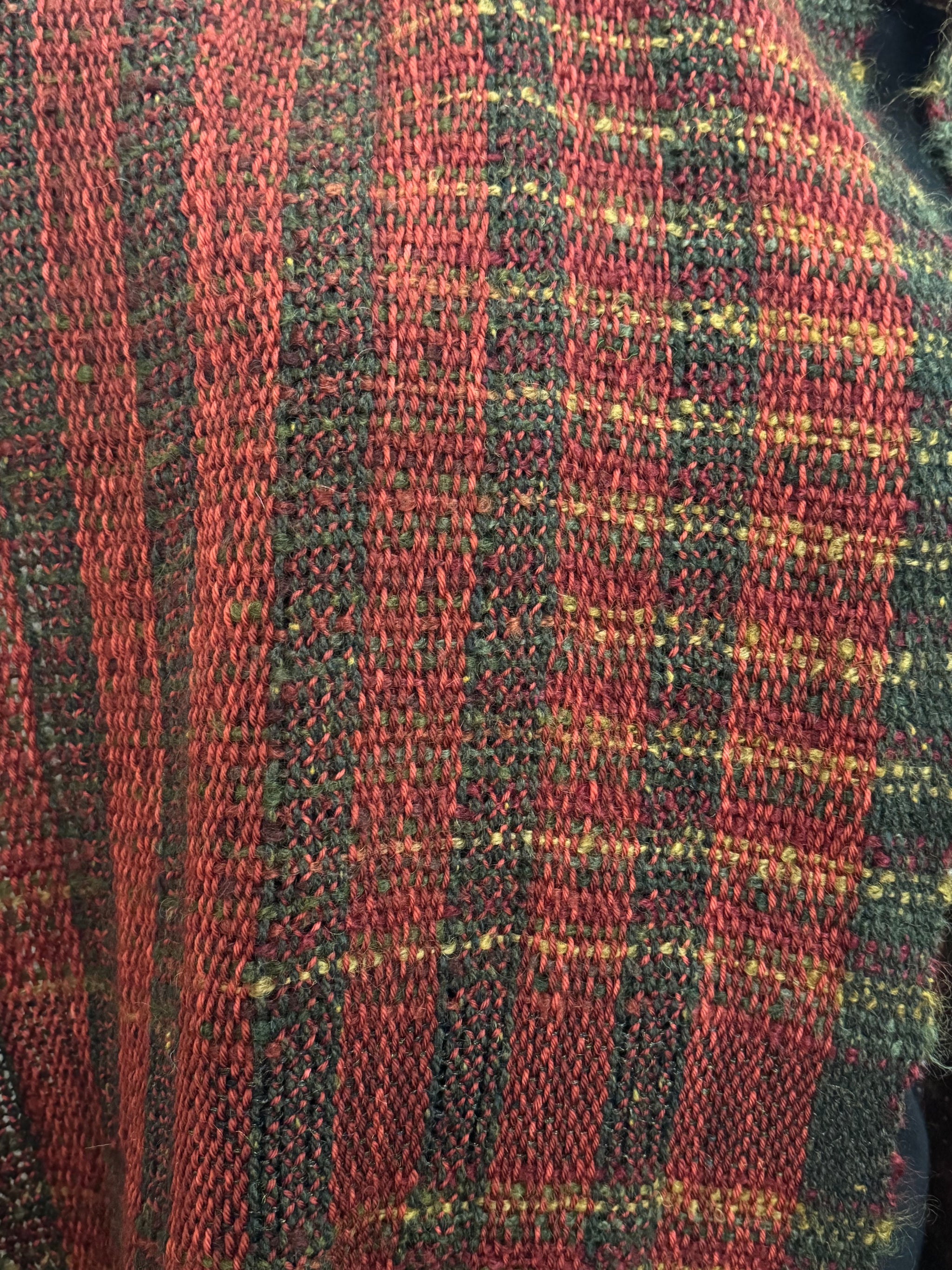 Soft and luxurious merino and mohair wrap/shawl in Chinese red and dark olive green and golden yellow stripes and flecks, Hand woven by Joy Dodd. 175cm long plus fringe X...